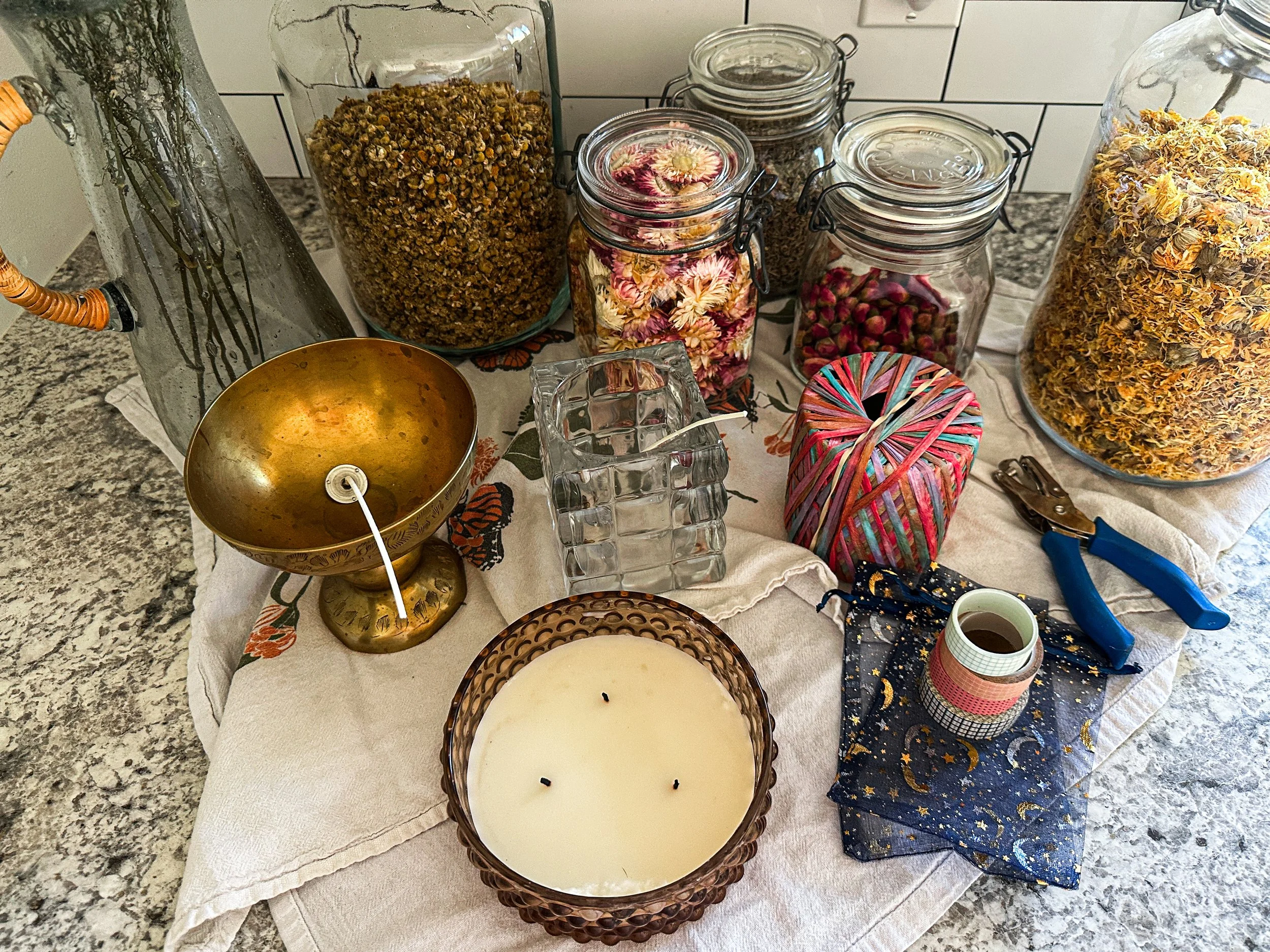 Candle vessels or decorative containers that can be reused for new candle making projects. I find beautiful crystal dishes, vintage amber glass, hobnail jars, brass vessels, etc. Steer clear of wood or any flammable materials, or poor quality glass that could run the risk of shattering.